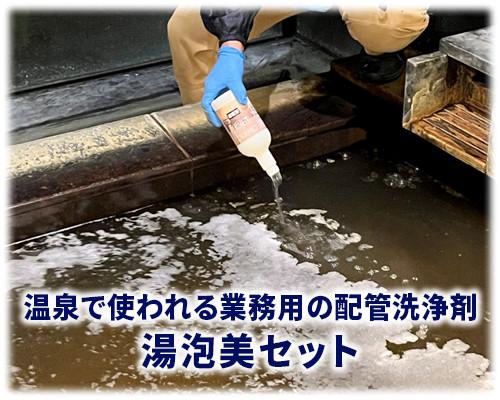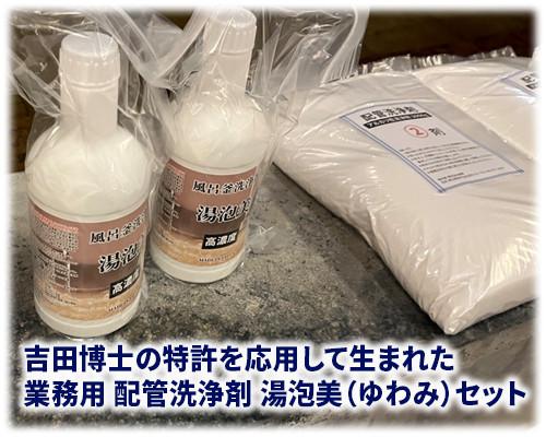 業務用配管洗浄剤湯泡美セットは「特許第2060821号 殺菌剤組成物及び殺菌剤の製造方法」を基づく技術を採用して作られたプロの洗浄剤セットです。このセットは温浴施設(旅館・ホテル・スポーツジム)で現在も使われています。
