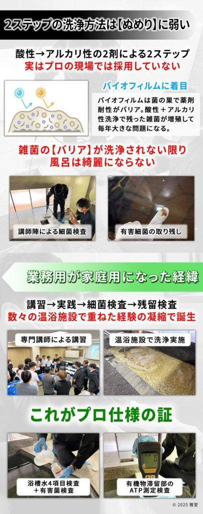 本記事でお伝えしている内容は、洗浄試験・安全試験等を実施した製品(例:特許第2060821号を採用している商品または美弥美セット・バスリセッター)およびヘドロトルネードに基づいて解説しています。他の商品は試験内容・成分構成が異なるため参考にしないでください。