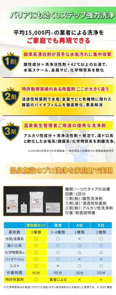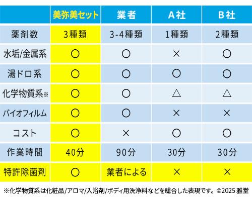 つまり風呂釜洗浄は1つでも薬剤が欠けると洗浄不十分になるリスクが高まるのです。家庭用の風呂釜洗浄剤美弥美(みやび)セットは3剤式で多少の時間がかかりますが、上記の理由によりご家庭でもプロ並みに洗浄を体験できます。