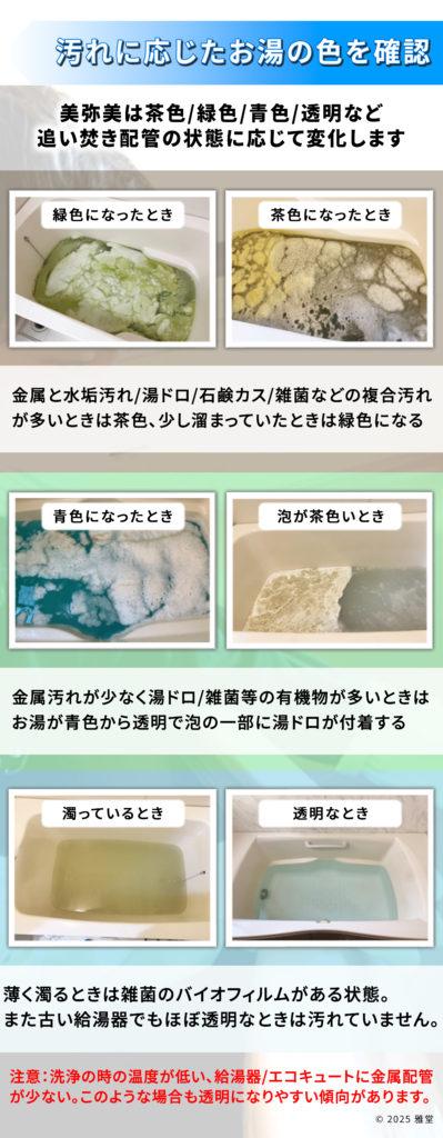 • 金属配管が少ないタイプの給湯器、または汚れの蓄積が少ないシンプル構造の給湯器はお湯の色が変化するほどの汚れは出ません。※茶色や濃い緑色の汚れが出ない、または少なくても正しく洗浄できています。