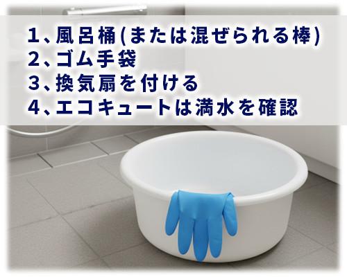 ●浴室の換気扇が動いていることを確認してゴム手袋を着用しましょう。●エコキュートは満水がお勧めです。●洗浄力をアップするため風呂桶(または混ぜられる棒)があると便利です。