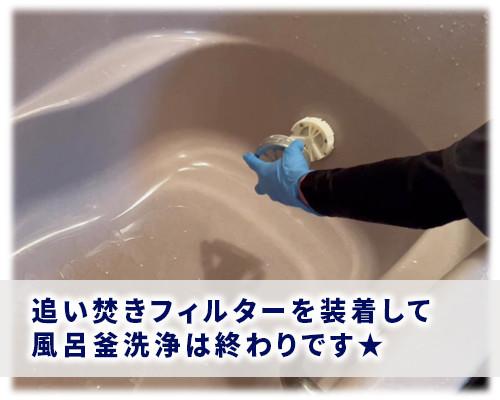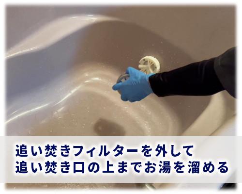 ※任意:5分が経過したらもう一度"追い焚き"をすると洗浄剤が行き渡り効果がアップします。