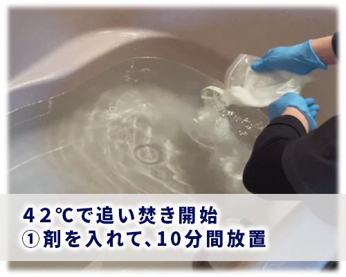 温度を42℃に設定して1回“追い焚きボタン” → ①剤を入れて10分間放置