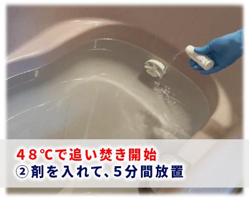 温度は48℃(または設定できる最高温度)で1回“追い焚きボタン” → ②剤を入れて5分間放置
