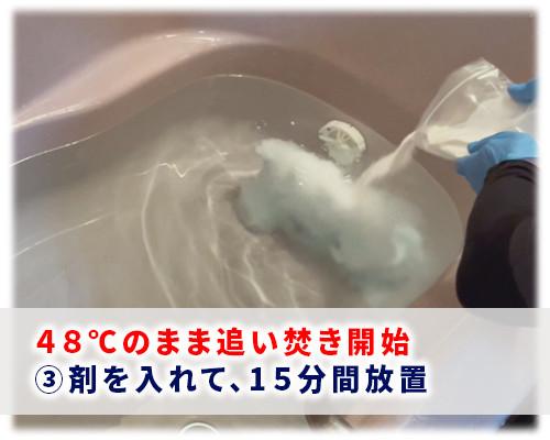 温度は48℃(または高い温度)のまま1回“追い焚きボタン”→③剤を入れて15分間放置