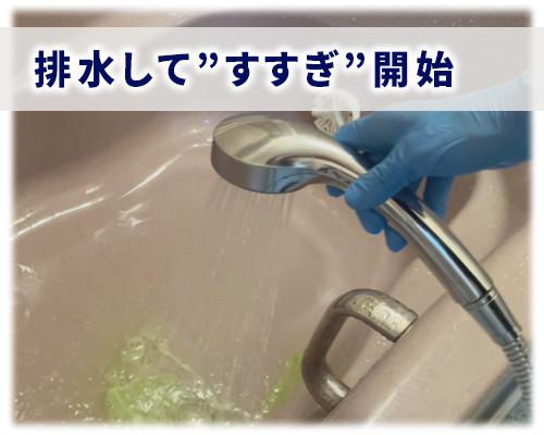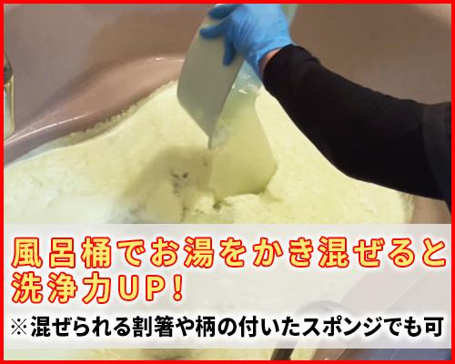 各種洗浄剤を入れたタイミングで、お湯を風呂桶(またはかき混ぜられる棒)でかき混ぜると、洗浄剤が素早く溶けて効果がアップします。常にかき混ぜるのではなく入れたときだけで、その後は放置で構いません。