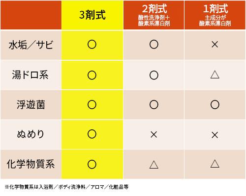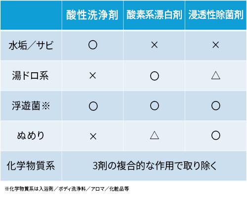 家庭用浴槽でも危険なレジオネラ属菌が検出された事例もあるため、「消毒」に位置する除菌成分を採用した3剤式をおすすめしています。