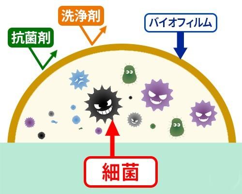 上記の汚れを住処にして増殖するものが雑菌で、雑菌は自身を守るために「ぬめり(バイオフィルム)」を発生させます。雑菌の「バリア」のようなものですが、そのぬめりは薬剤に耐性があるので簡単には除去できません。