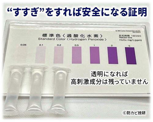 風呂釜洗浄剤に使われている過炭酸ナトリウムは、お湯に溶かすと過酸化水素と炭酸ナトリウムに分かれます。そのうち過酸化水素は酸化性のある高刺激成分で、高濃度になると劇物に該当します。湯泡美の効果を大きく高める過炭酸ナトリウムでも残留してしまうと危険なため、当研究所は過酸化水素濃度の検査をして安全性の確認をしています。
