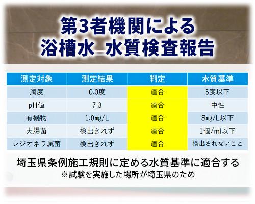 温泉施設では定期的に水質4項目(または6項目/有機物・大腸菌・レジオネラ属菌)の検査をして、レジオネラ属菌が検出されなかった証明を保健所に提出する義務があります。家庭用にその義務はありませんが、家庭用の美弥美セットとバスリセッターは使用者の安全を目的として、一般家庭の浴槽でも水質検査試験を行っています。その結果、すべての項目にて基準値未満の安全性が証明されています。