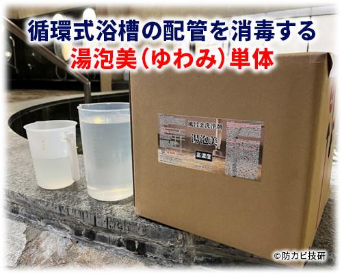 湯泡美(ゆわみ)は、温浴施設の配管内部に潜む細菌(いわゆる雑菌)を除菌するために使われている消毒剤です。その高い除菌効果を採用して家庭用の風呂釜洗浄剤に応用したものが「風呂釜洗浄剤美弥美セット」や「バスリセッター」になります。