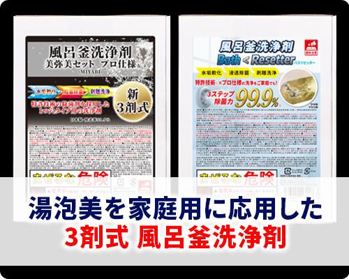 この洗浄システムを応用して開発された家庭用 風呂釜洗浄剤が「風呂釜洗浄剤美弥美セット」と「風呂釜洗浄剤バスリセッター」です。
